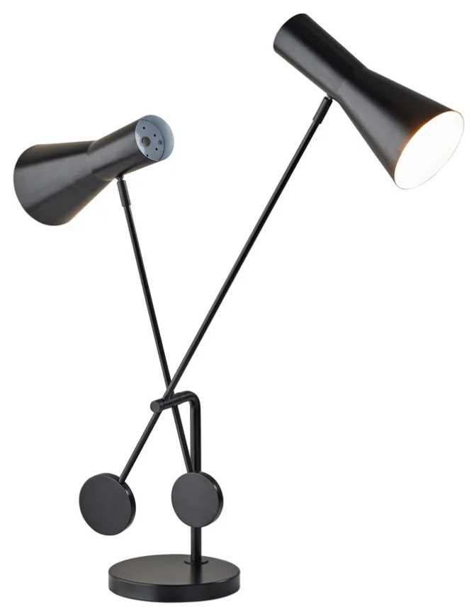 The Bond desk lamp by ADS360 is an artistic and functional statement piece to complete your modern industrial décor. Featuring two black cone metal shades affixed to two stems with round decorative ends, the lamp has a matching black metal stem and base.Read More