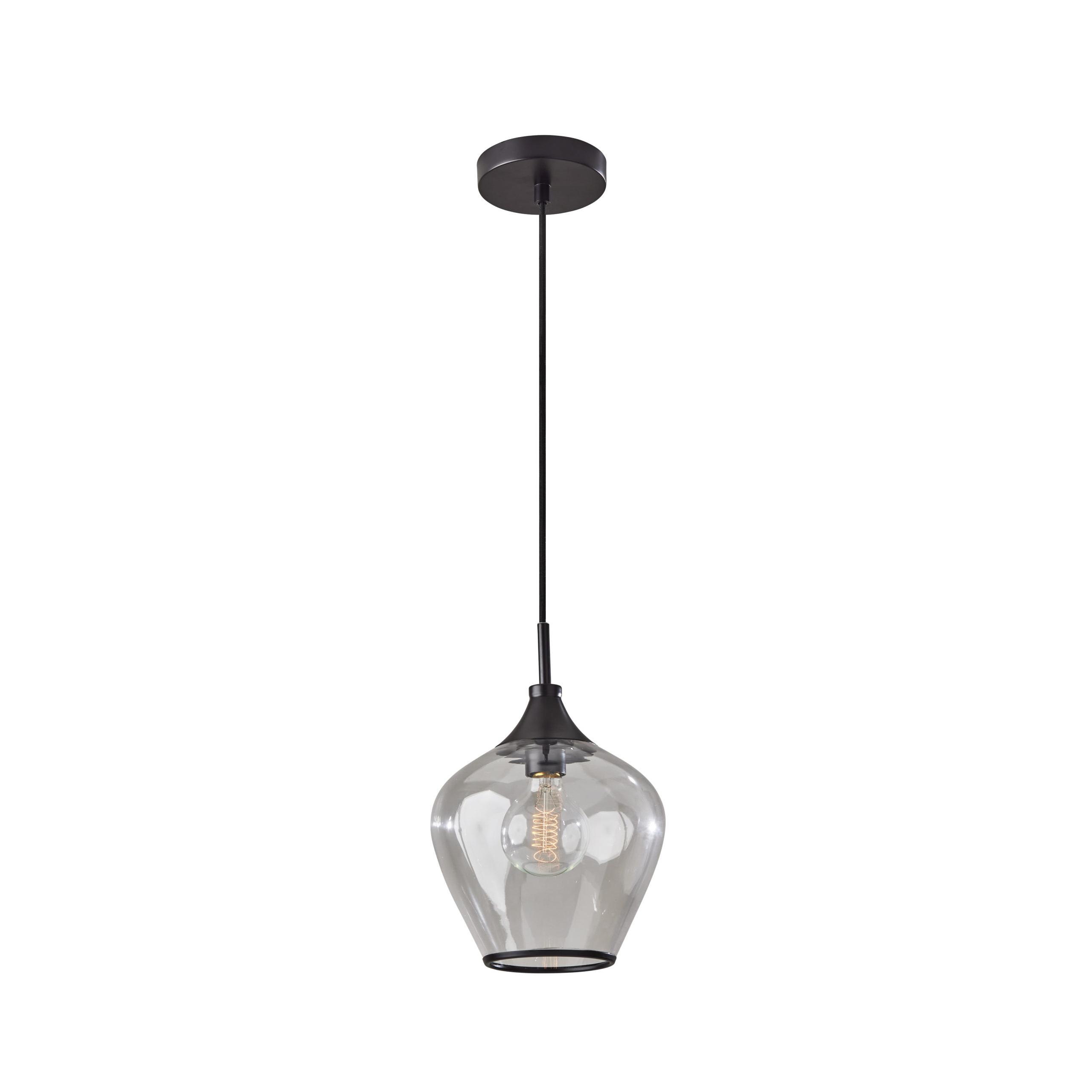 Add an eye-catching design piece to your bedroom or living space with the Bradford pendant lamp. It can be hung by itself or paired with several more to create a stunning effect and add illumination to your room. With warm light shining through a clear tulip-shaped glass shade, this lamp creates a look that is as aesthetic as it is functional. The 12.75” tall light features a 5” diameter round ceiling plate and simple but chic stem with a dark bronze finish, and a matching metal rim accenting the glass shade, making it the perfect solution to provide lighting and vintage décor to any space. Completing the vintage look is an included 40W Edison bulb. With a 6′ black fabric-covered cord, the height of the lamp can be adjusted to suit the needs of any room regardless of the ceiling height. Complete your space’s look with the coordinating Bradford wall lamp, floor lamp, and desk lamp.Read More