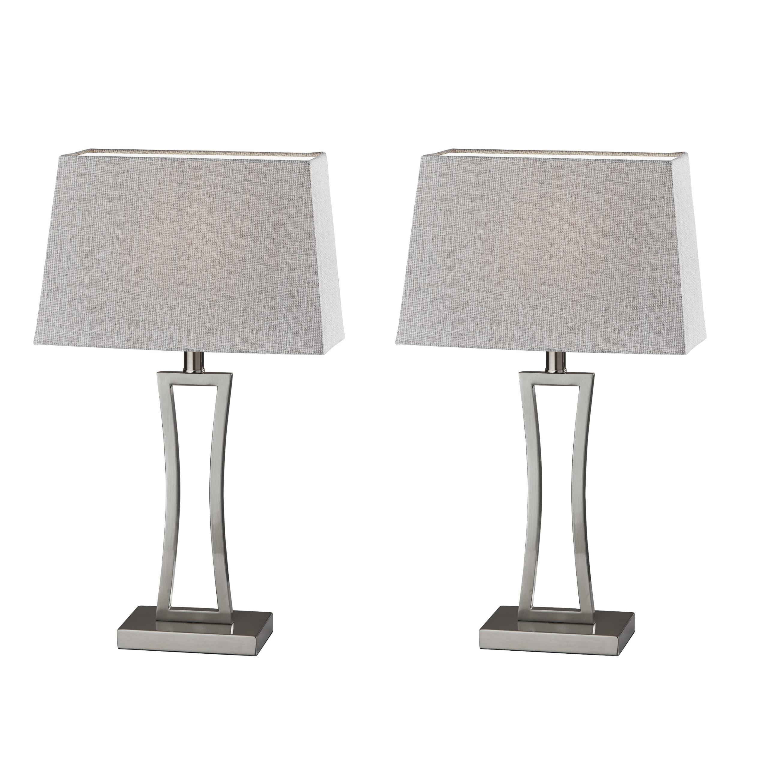 Create a modern matching look with the Camila 2 Piece Table Lamp. Each lamp features a brushed steel open rectangular frame. Mimicking the rectangular shape of the base, the lamp shades are made up of an eye catching mixture of white and grey woven fabrics. At a 24.25″ height, these lamps are perfect for each end of the bedside or a console table. A simple rotary switch is located on the socket controlling a 100W bulb (not included).Read More