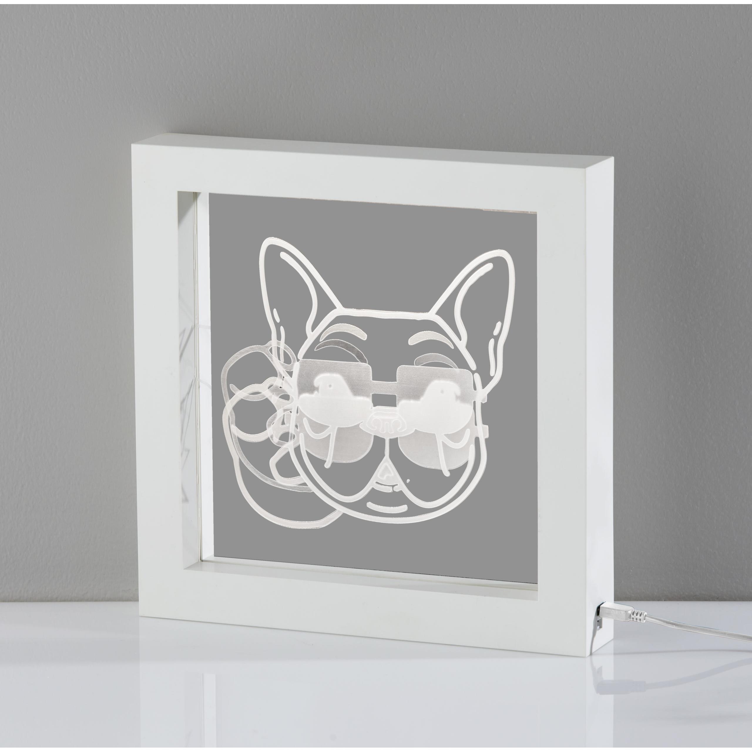The perfect choice for dog lovers with a pet as cool as they are! The french bull dog in sunglasses art is illuminated in white LED light on this piece that can be wall mounted as eye-catching wall art or can stand free on tables, shelves, nightstands, or counters. Measuring 9″ tall by 9.25″ wide including a white plastic frame, this light box includes a 7.25″ square window with art illuminated in white LED light. The light can be easily turned on or off with a push button switch. The 0.3W LED can be powered by either 3 “AA” batteries (not included) for a clean, wire-free aesthetic. Alternatively, the light box can be powered using the included 8′ USB cable for unlimited use without needing to worry about replacing batteries.Read More