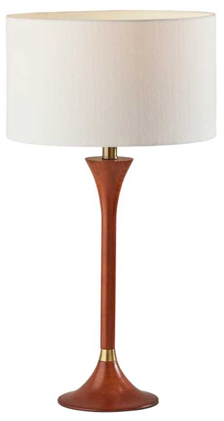 The 7" diameter round base and matching stem are made of rubberwood with a rich walnut finish that highlights the wood grain. The lamp also features a short 8" high by 14" diameter drum shade in the white textured fabric that perfectly complements the warm wood tones and metal accents. Operated by a rotary socket switch to easily turn it on or off, the Rebecca table lamp houses a 100W bulb (not included) and features a 5' clear cord. This lamp is also available with a lighter, natural finish.
