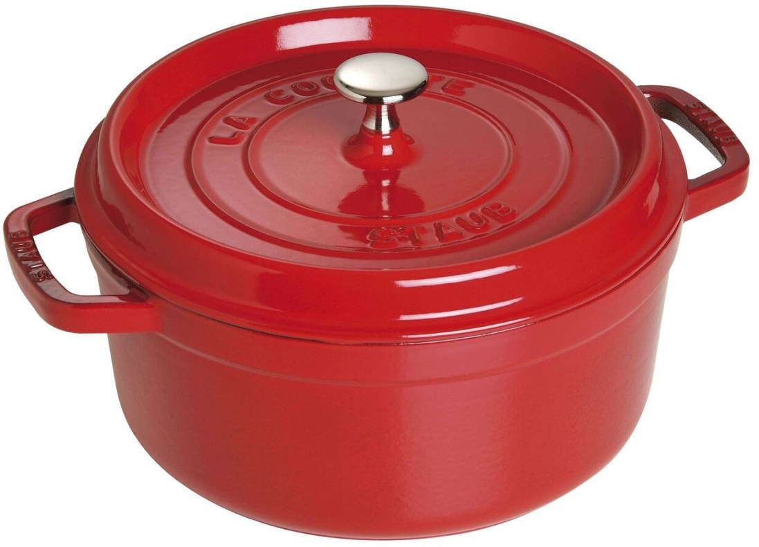 This particular cocotte is red, adding a hint of elegance when presenting food at the table, round and has a diameter of 24 cm. As well as being aesthetically pleasing, cast-iron is an excellent heat retainer and is good at distributing heat equally, characteristics which are enforced by Staub's special matte black enamel. This enamel also helps preserve a food's unique flavour. Since a cocotte retains heat well, meat and vegetables can be cooked gently whilst preserving both flavour and nutritional content
