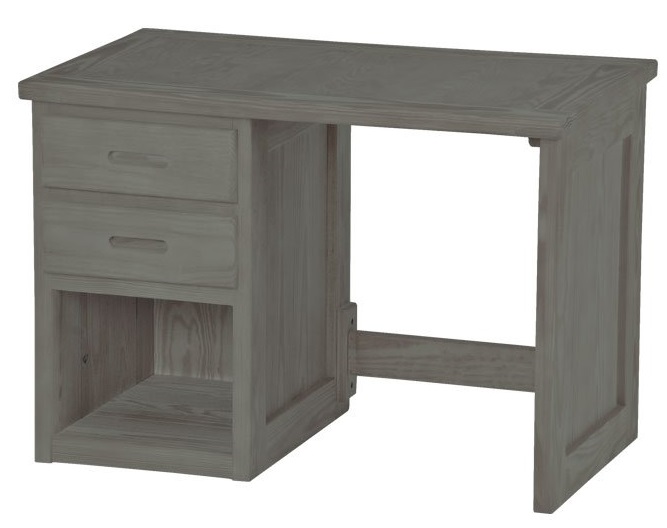 A compact desk with 2 drawers and an open shelf to keep everything organized.Consider adding a lacquer finish on the top for increased moisture resistance and easier cleanup of spills. Add a desk shelf for more storage.