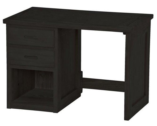A compact desk with 2 drawers and an open shelf to keep everything organized.Consider adding a lacquer finish on the top for increased moisture resistance and easier cleanup of spills. Add a desk shelf for more storage.