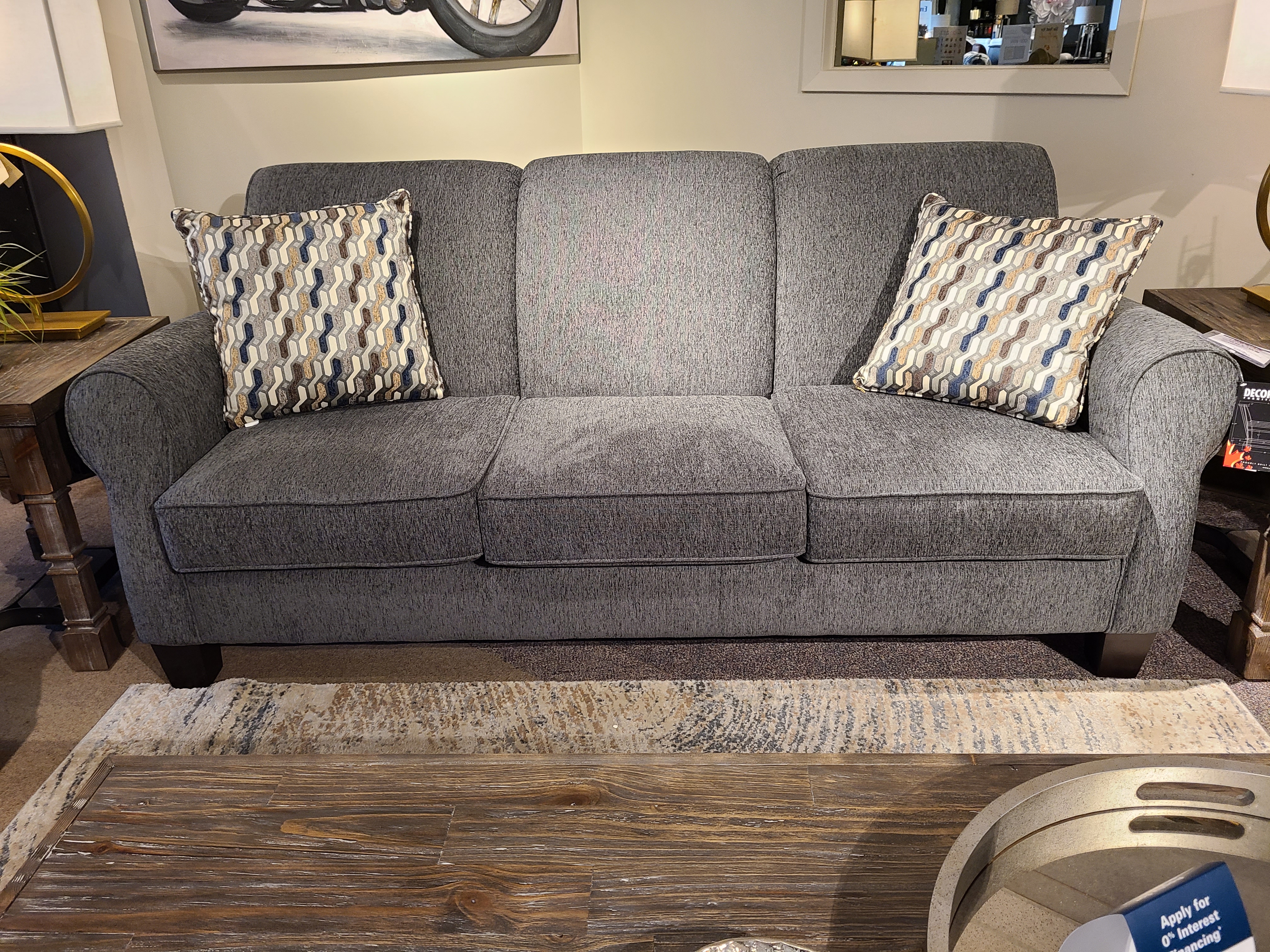 This sofa is a beautiful mix of style and comfort. With strong back cushions added along with the three welded seat cushions, this sofa is one that everyone likes to lie in or just lie on. The sofa's rollered welded arms and pyramid feet add elegance to your living room. Come on with 2 pillow decorations