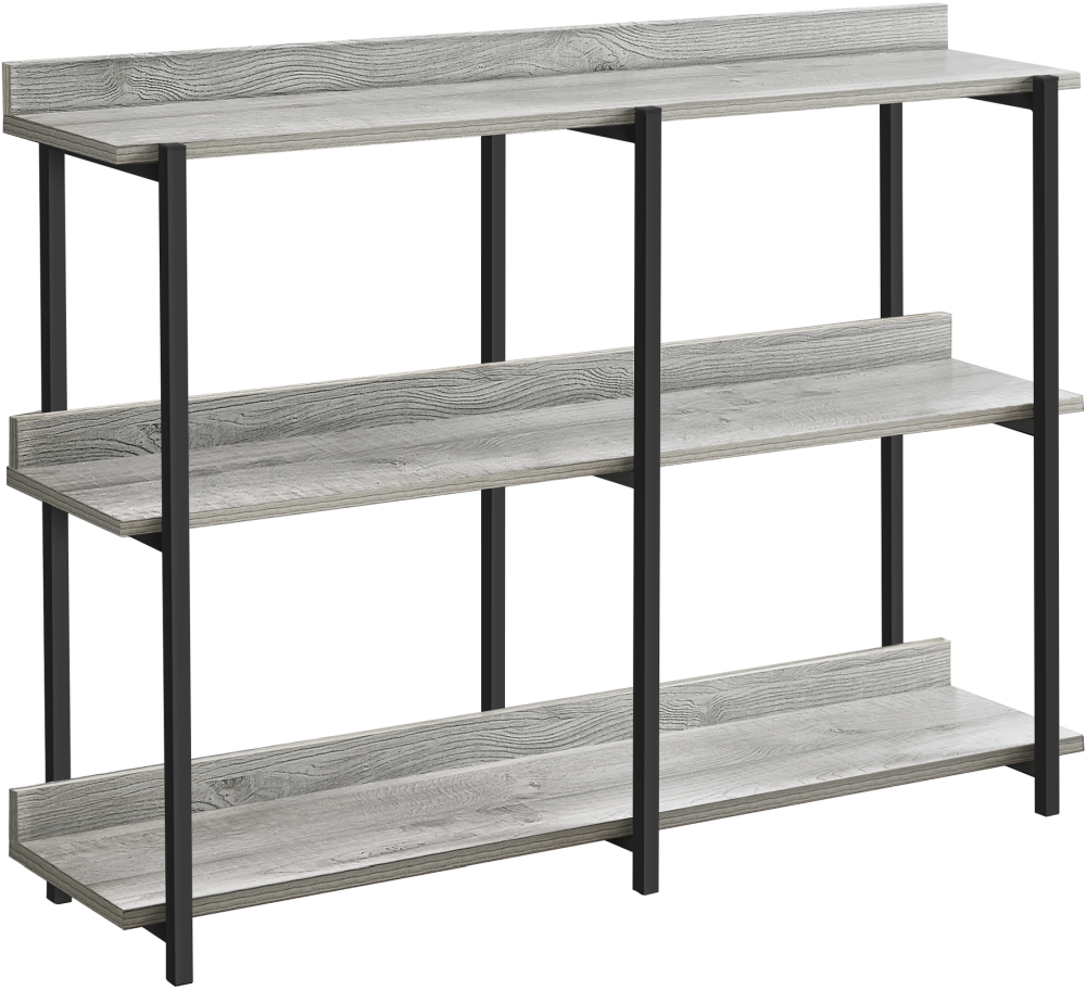 Proudly display prized possessions on this rectangular console table with 3-tier shelving. Underneath the long, narrow tabletop are shelves arranged on 2 levels. Distribute books, plants, and decorative items among the tabletop and shelves, which are in a grey laminate finish.Read More