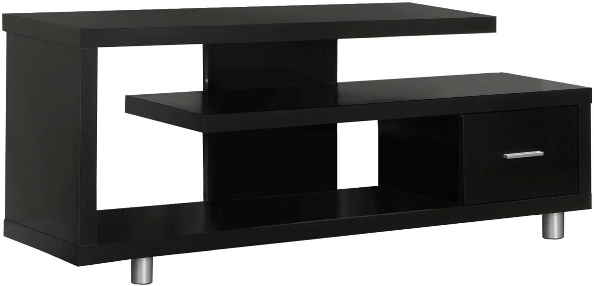 Enhance the look of your living space with the contemporary styling of this Art-Deco inspired TV stand. Constructed with thick panels in a rich cappuccino finish on all sides and two sturdy round metal legs; this stand features open concept shelving and one drawer ideal for media storage solutions. This console unit accommodates all TV sizes with a center stand and will be a stand out in your living room, family room, den, or basement space.