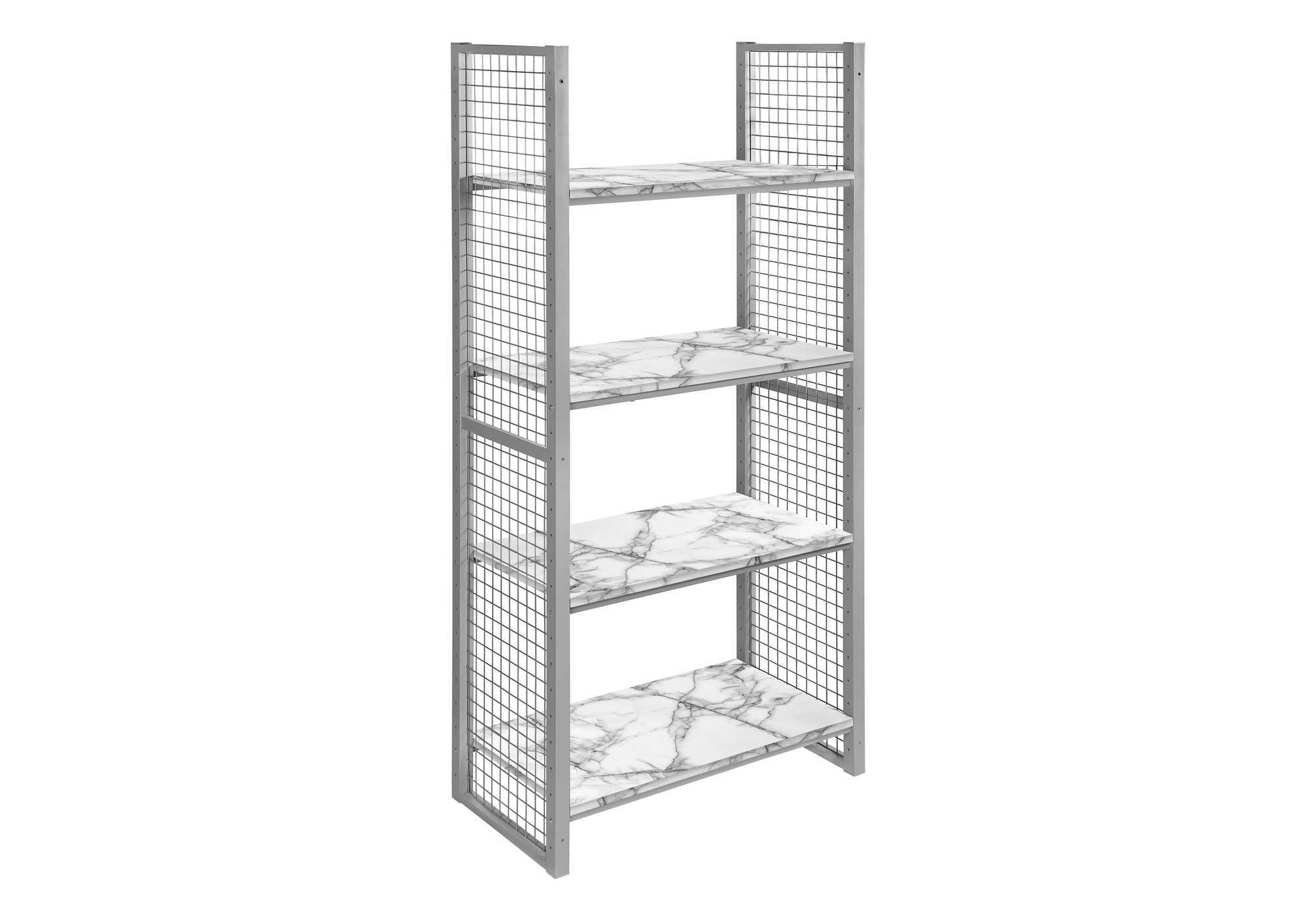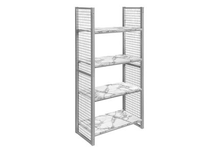 A slleek and stylish display rack made of silver metal with a trendy white marble laminate finish on the shelves