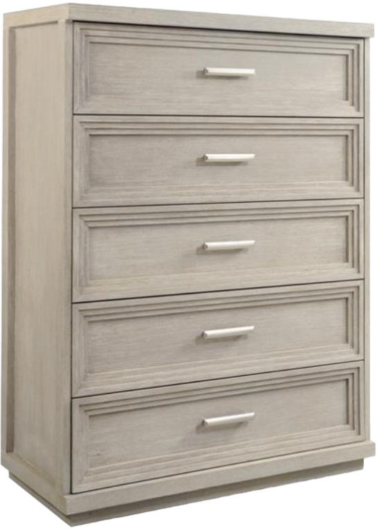 Cascade offers a fresh look with detailed shapes and refined styling. Inspired by the trend of modern coastal interior design directions, the collection makes it easy to bring home the feeling of vacation with a light and breezy style. A minimalistic approach and modern sleekness convey the collection's relaxed attitude. Floating plinth bases give the group a light and airy feel while a stepped-down border on drawer faces provides a cascading effect and architectural detail. Clean, fresh color palette: a soothing tone of Dovetail create a modern, relaxed feel. Subtle wire brushing adds a textural element. Brushed nickel bar pulls add a touch of shimmer to its naturally soothing palette.