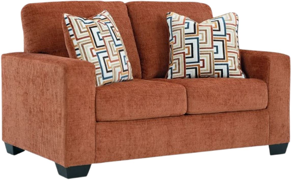Looking to make a bold statement with color? Liven up your living room with this loveseat. Its trend-right burnt orange upholstery adds a playful pop of color to your decor. Bold and eclectic accent pillows complete the look. Pairing posh style with everyday comfort, this piece is a welcome addition to contemporary spaces.Read More