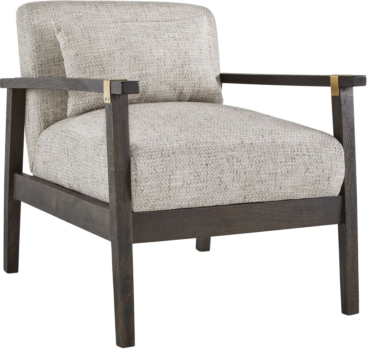 Chic and sleek, this accent chair satisfies your taste for contemporary design. Its dark finish brings a sense of refinement, while cement-hued upholstery has a neutral appeal. And with antiqued brass-tone hardware for a touch of glamour, it's easier than ever to sit back and relax in striking style.Read More