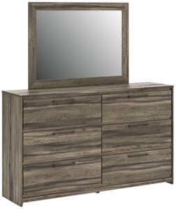 Casually cool style and lots of storage go hand in hand with this dresser and mirror. A weathered brown finish over replicated oak grain creates an easygoing vibe, setting the scene in your restful retreat. Clean lines and modern handles provide a fuss-free look.Read More