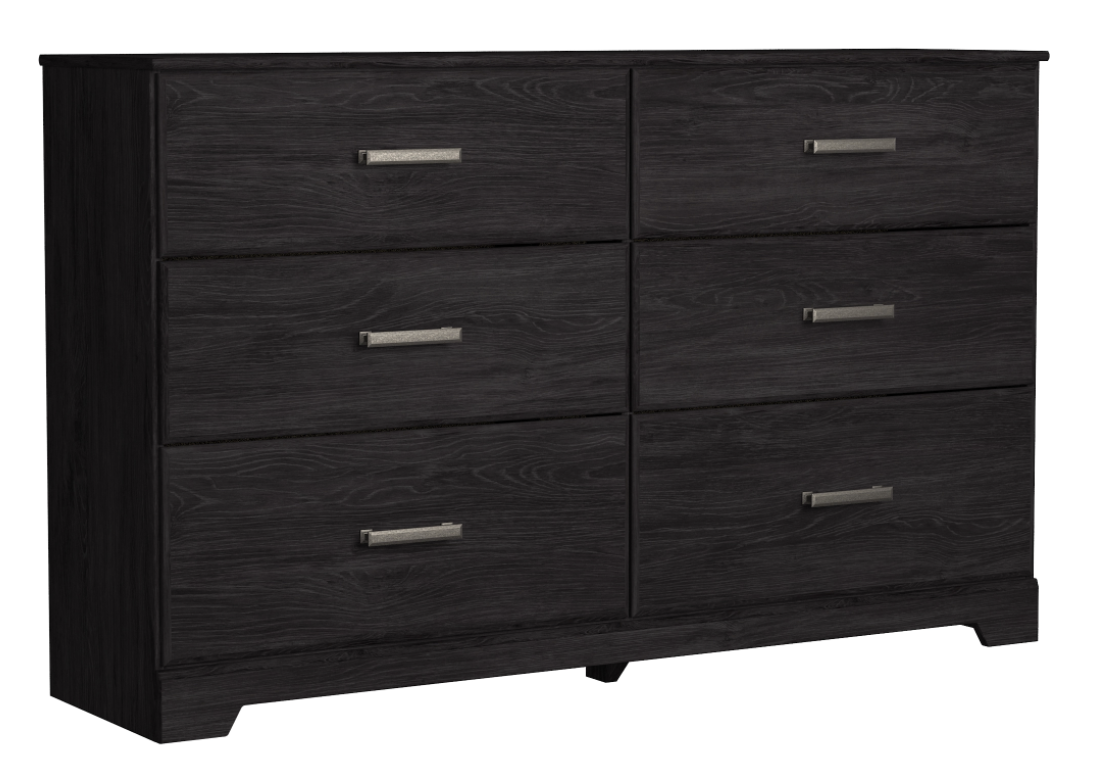 Dark charcoal finish over replicated oak grain. Large dark pewter colour handles with an aged appearance accent cases. Side roller glides for smooth operating drawers. Mouldings across headboard give a thick planked look. Queen (71) and king (72) headboards can attach to a bolt-on metal bed frame B100-31 or B100-66 respectively.