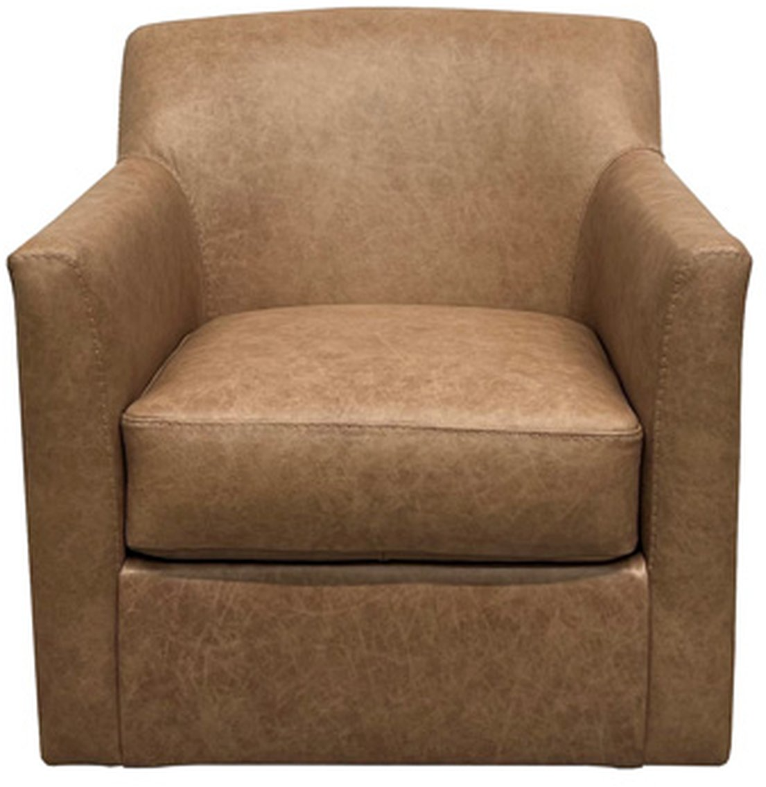 Accent chair. Shelter arm. Leather match upholstery in tumbleweed. Tight back and loose, non-reversible seat cushion. Metal swivel base. Coordinating stationary group 57302.Read More