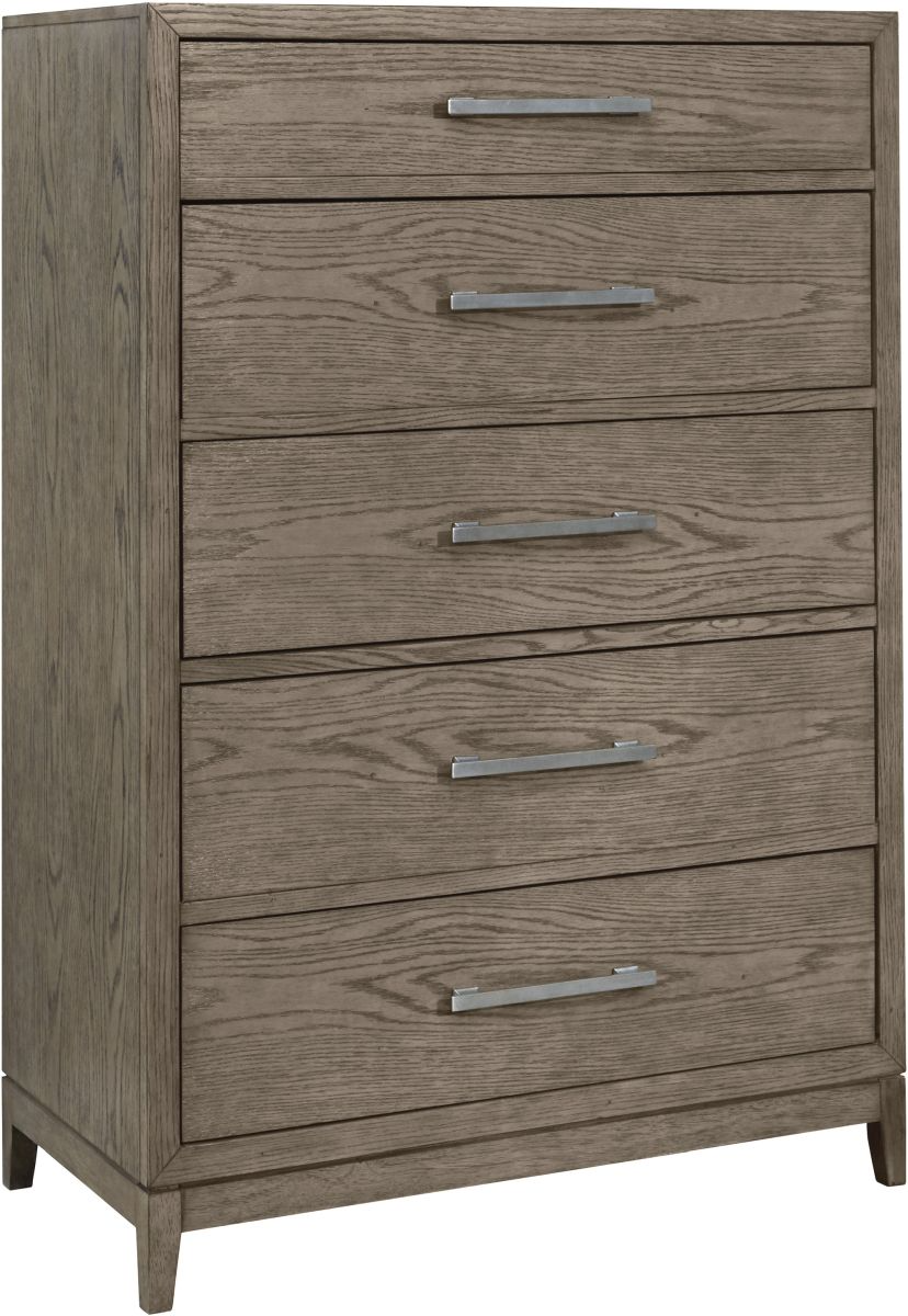 You want your room to reflect your refined sensibilities while remaining forward-thinking in design. The simple silhouette of this chest of drawers opens the door to a bedroom with the curated look and subtle flair you desire. Striking metal bar pulls in a light pewter tone are functionally fashionable against the piece's elegant waxy gray finish. Ample drawer space allows you to store in streamlined style.Read More