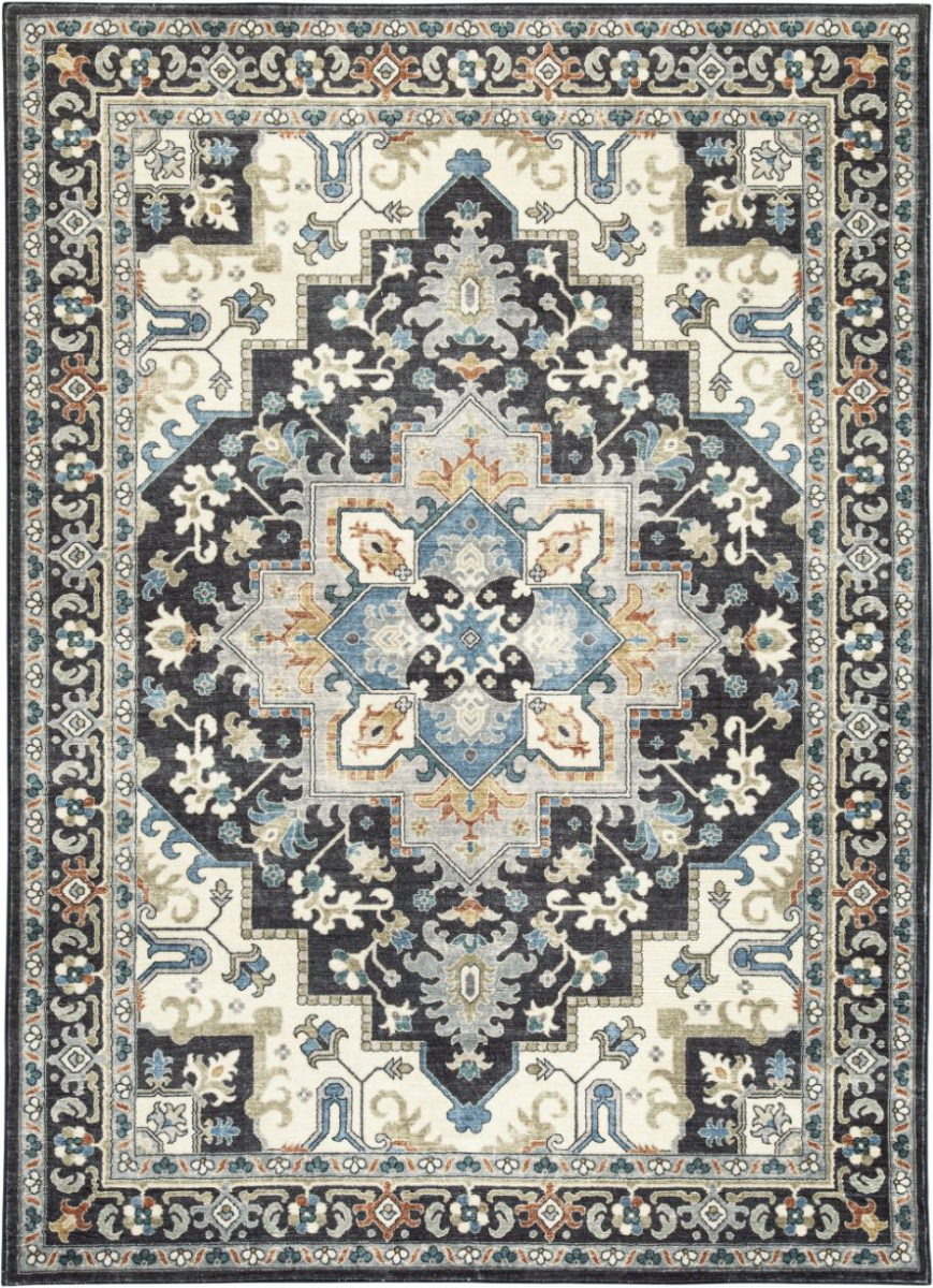Machine woven, printed medallion design in shades of black, cream, blue, teal, gray, rust and ocher