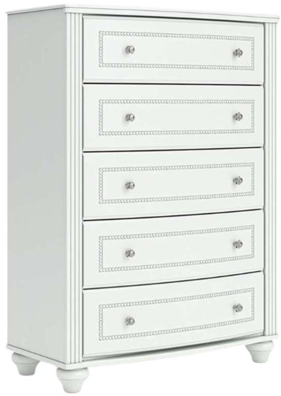 Fit for a princess. This chest of drawers’ crisp matte white finish pairs with charming elements like bun feet, crystal knobs and ornate beading—the perfect crowning touches for your girly girl. This spacious five-drawer piece is sure to make your little one feel like royalty.Read More