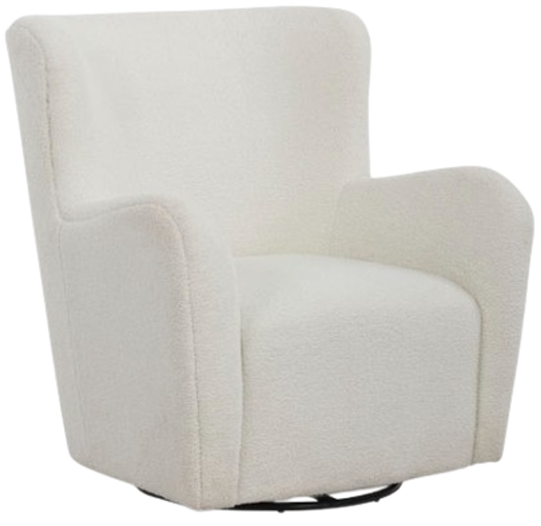 This cream swivel-glider chair offers a calm, inviting place to relax. It gently glides and rotates 360°, making it perfect for reading, relaxing, or watching TV. Plush seat and supportive back cushions cradle you comfortably. Its neutral tone blends smoothly into varied interiors.Read More