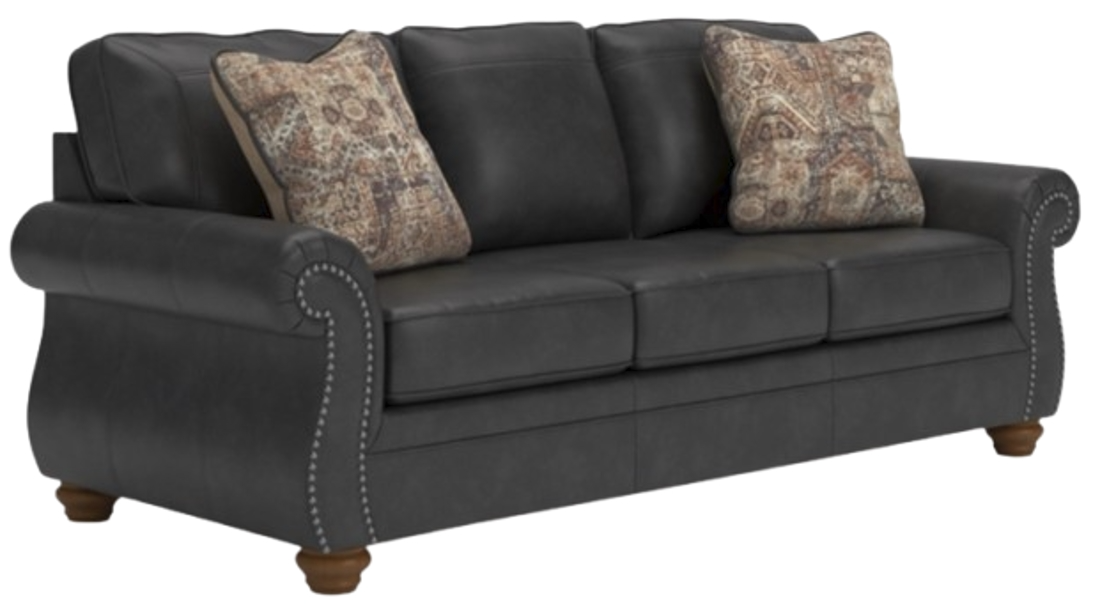 Everyone can have the best seat in the house with this sofa. Its nailhead trim puts the finishing touches on the traditional roll arms you love. Comfy, durable cushions—wrapped in a rustic yet sophisticated faux leather—keep you feeling relaxed. Chenille pillows in a distressed motif pattern add another layer of comfort.Read More