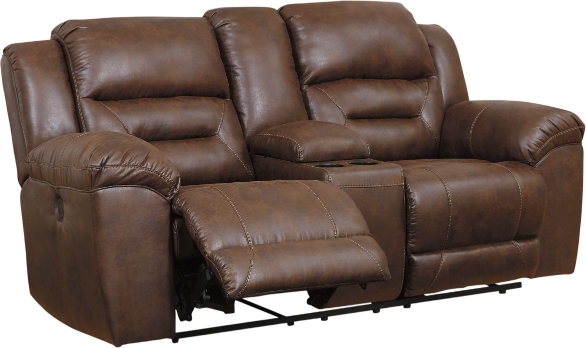 How could relaxation on the Stoneland power dual-reclining console loveseat with pillow arms, bustle back cushions, and faux-leather upholstery get any better? With built-in storage and 2 cupholders that keep your favorite beverages nearby.